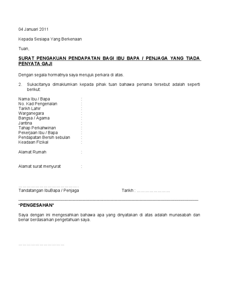 Surat Pengesahan Ibu Bapa Tanpa Penyata Gaji Pdf