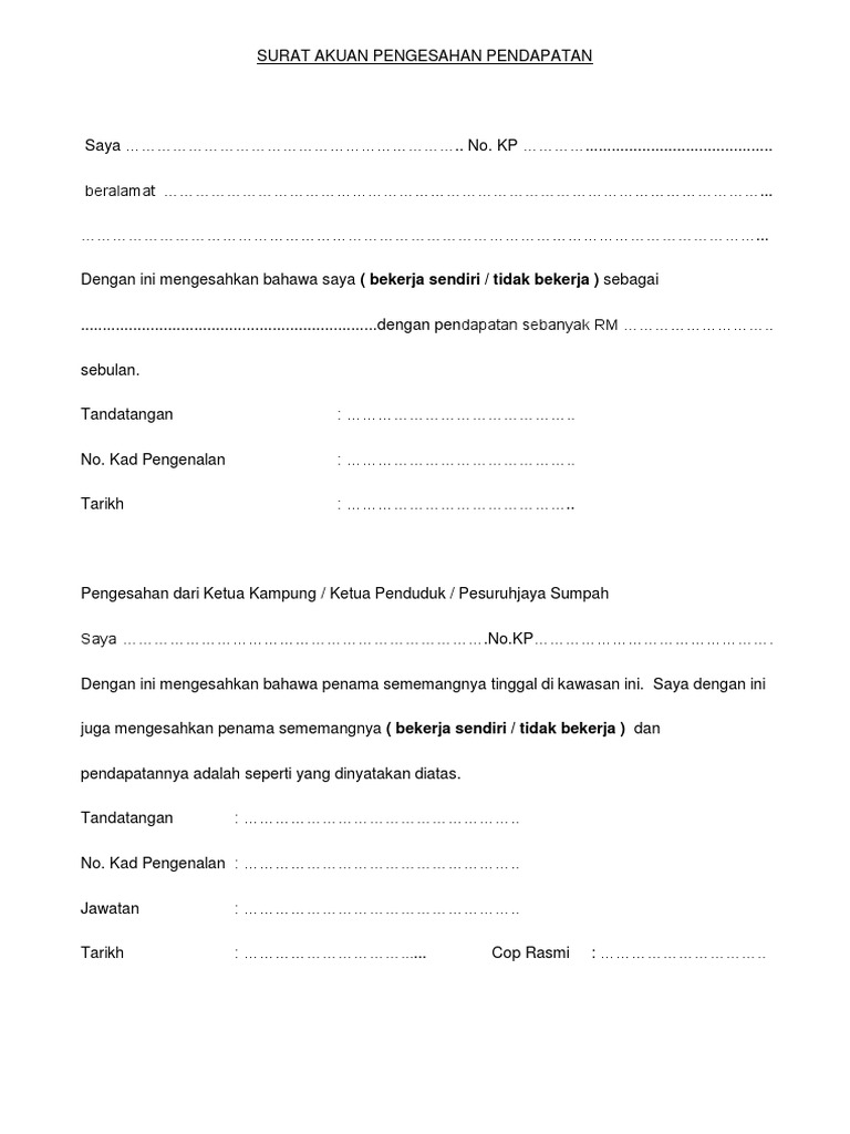 Surat akuan kerja sendiri atau tidak bekerja 31 3 2017 1 pdf surat akuan tiada slip gaji tidak bekerja nama course hero. Contoh Surat Pengesahan Pendapatan Pencen - Contoh surat akuan pendapatan dibawah boleh dijadikan rujukan untuk meraka yang berkerja sendiri pengesahan pendapatan. Contoh surat pengesahan majikan dan jawatan.